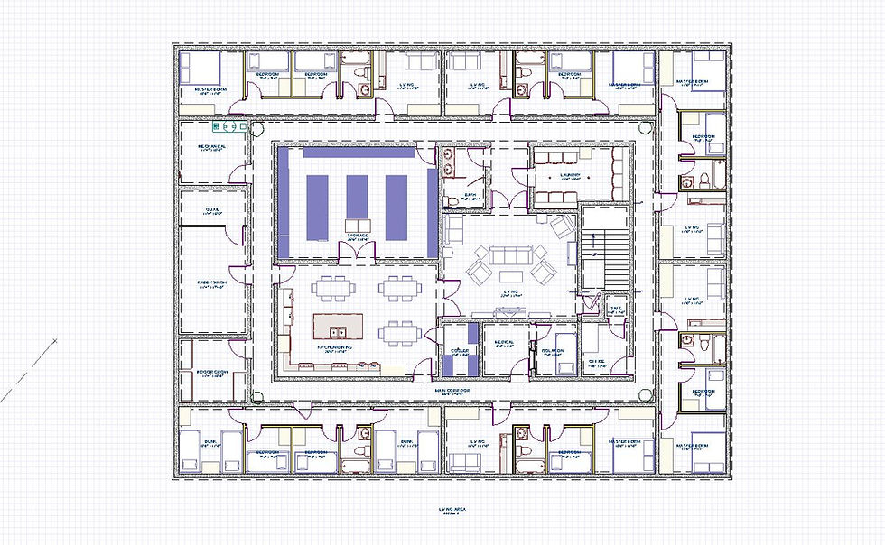 With enough sleeping space for up to 34 people in six separate living quarters. All surrounding a central living area. With a massive Kitchen, Storage Room, Living Room, Laundry Room, Mechanical Room, Grow Room, Animal Farm, and a Medical bay. This plan is laid out and designed with long term survival in mind. Surrounded around the exterior with a double steel fence, there is room for a garden and chickens. The central garden atrium within the walls would be ideal for a couple of fruit trees, berry bushes, bee hives, and nut trees. Secret exits not shown for safety! Check out the full walk through and let us know what you think!